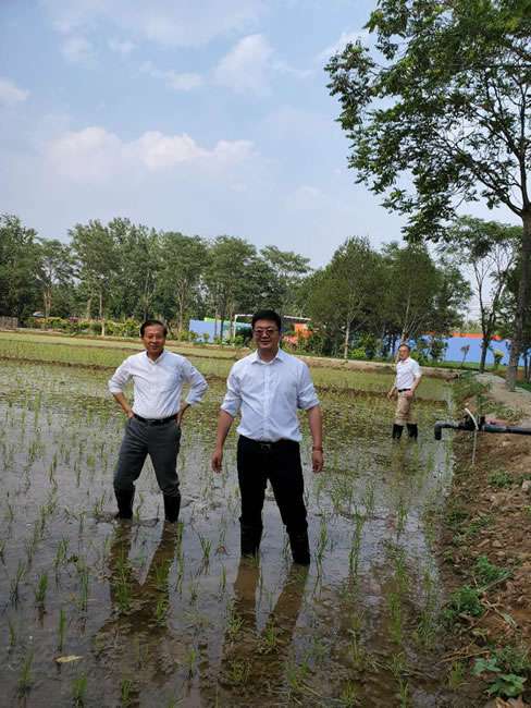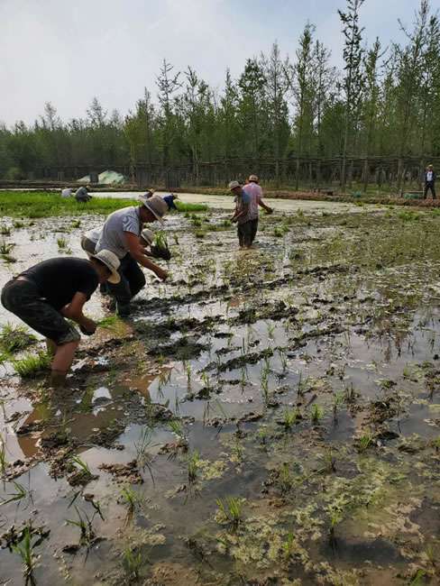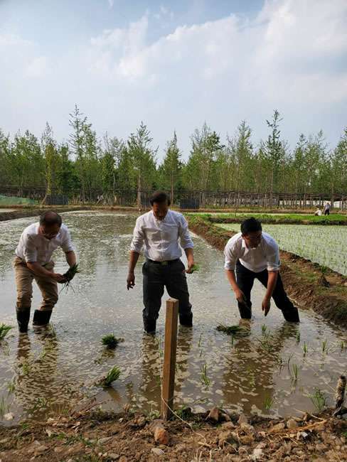 日前,环球体育-环球online(中国)董事长梁雨、总裁谢俊率集团高级管理人员来到位于北京西四环外的锦绣大地生态园,在景色迷人的玉泉山山下,同志们挽起裤脚跃进田里,生态园农业技术员一边弓腰示范,一边讲解道“插秧是个技术活,将秧苗窝在虎口处,既要轻又要稳,用巧劲儿将秧苗抛在泥里,不能抛得太深,又要确保植保灌溉时,秧苗不漂浮在水面上。”